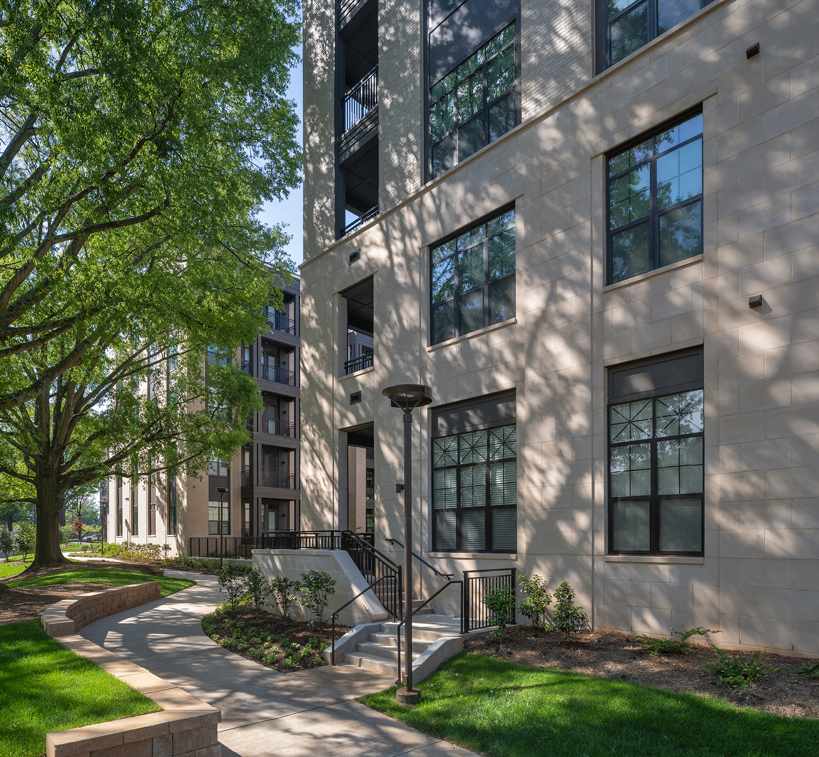 The original Colony Apartments were built in the early 1970s and covered the 27-acre site at the corner of Colony and Sharon Roads, now in the center of the affluent Charlotte neighborhood, South Park. The principal developer has owned the land for 45 years and has been plotting the redevelopment of the site for well over a decade. The overall master plan boasts 990 apartments, 300,000 sf of retail anchored by a major grocer, 250,000 sf of office, and a 225-room hotel. Various delays including the pandemic pushed back the start of the project for years. Like most projects, the team was forced to pivot to make the project viable. With the uncertainty of retail, the first phase of multi-family moved up the timeline. In the summer of 2022, the 350-unit multi-family apartment building was delivered as part of the reimagined, state-of-the-art, mixed-use community.