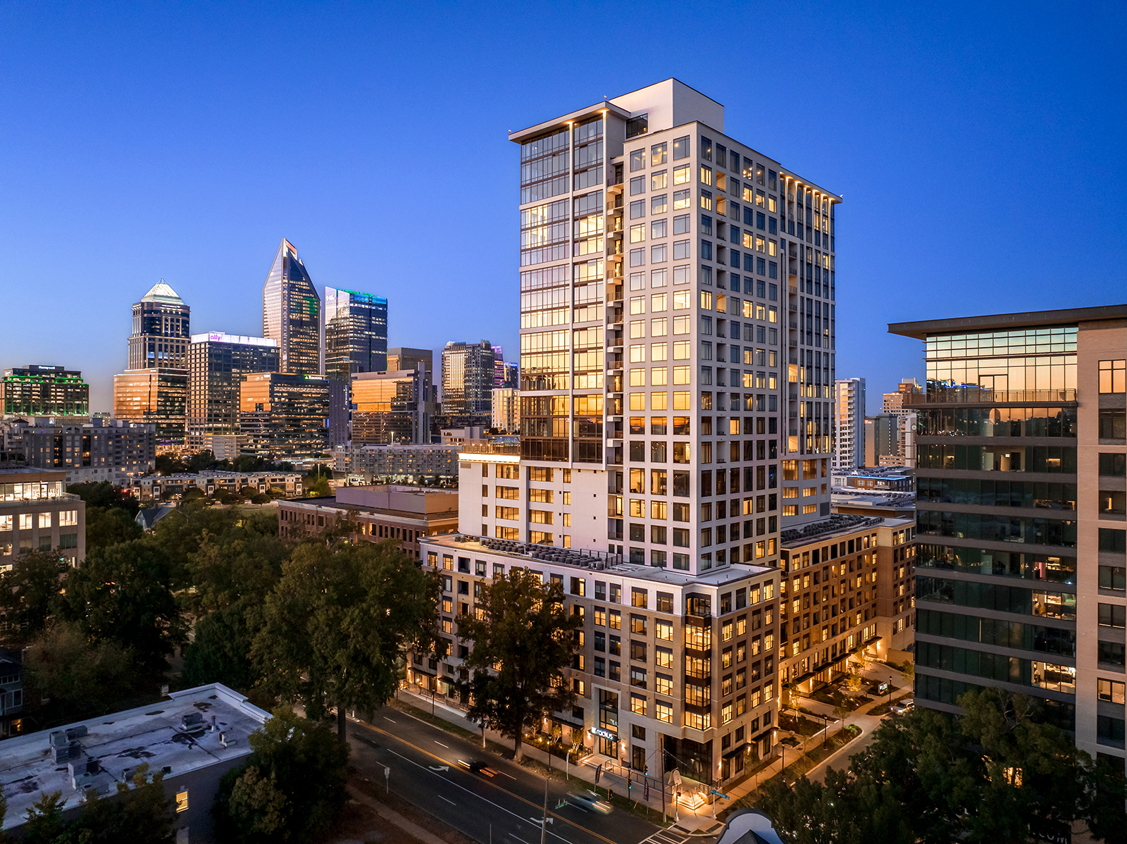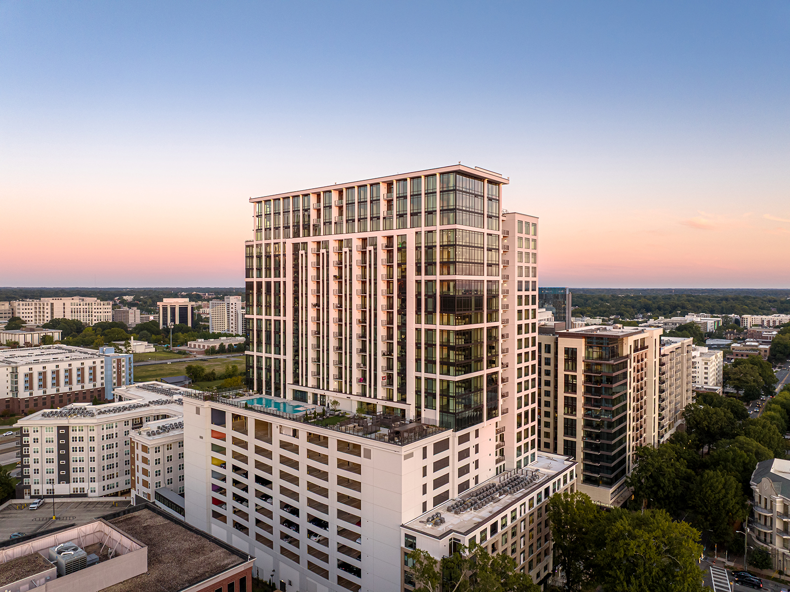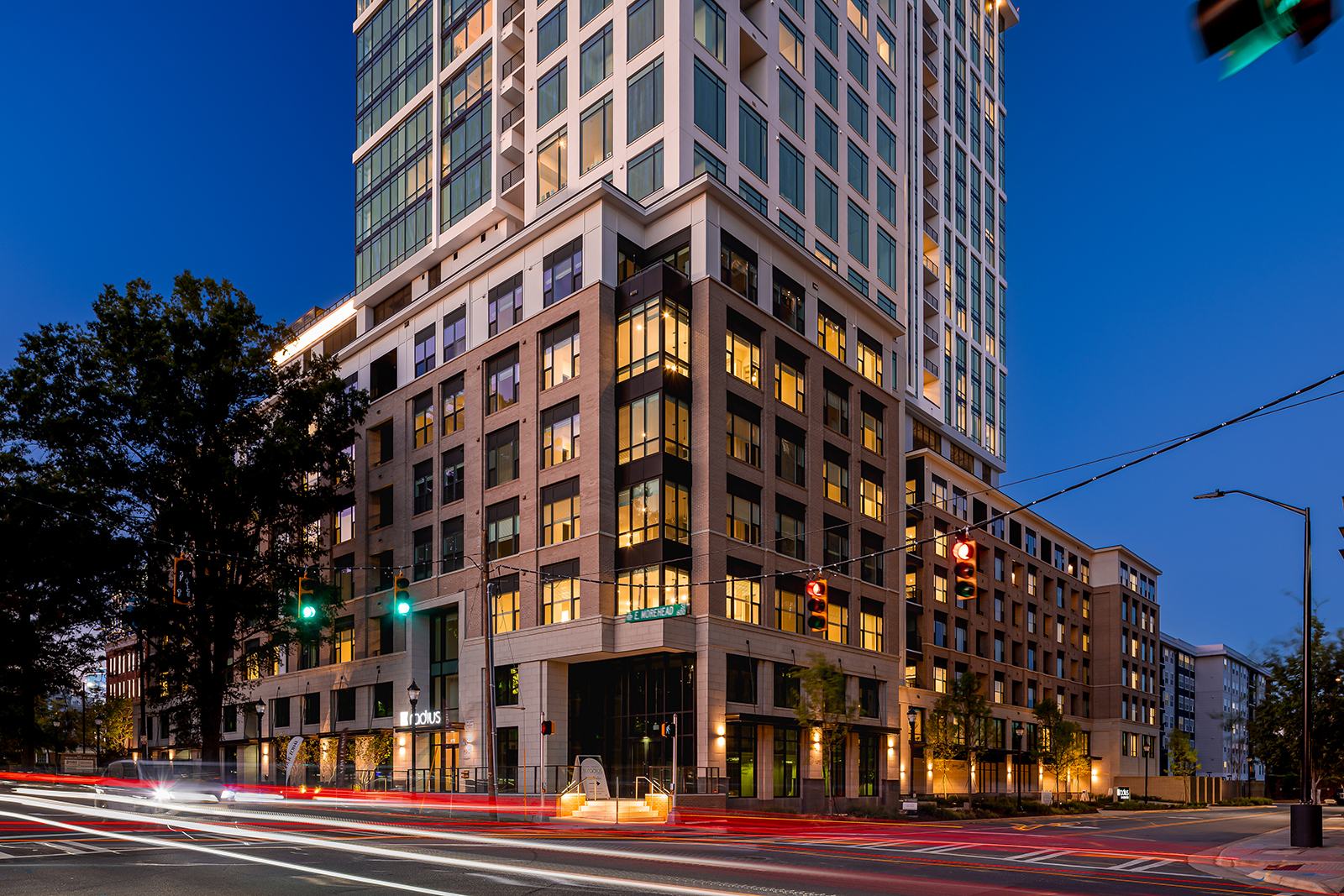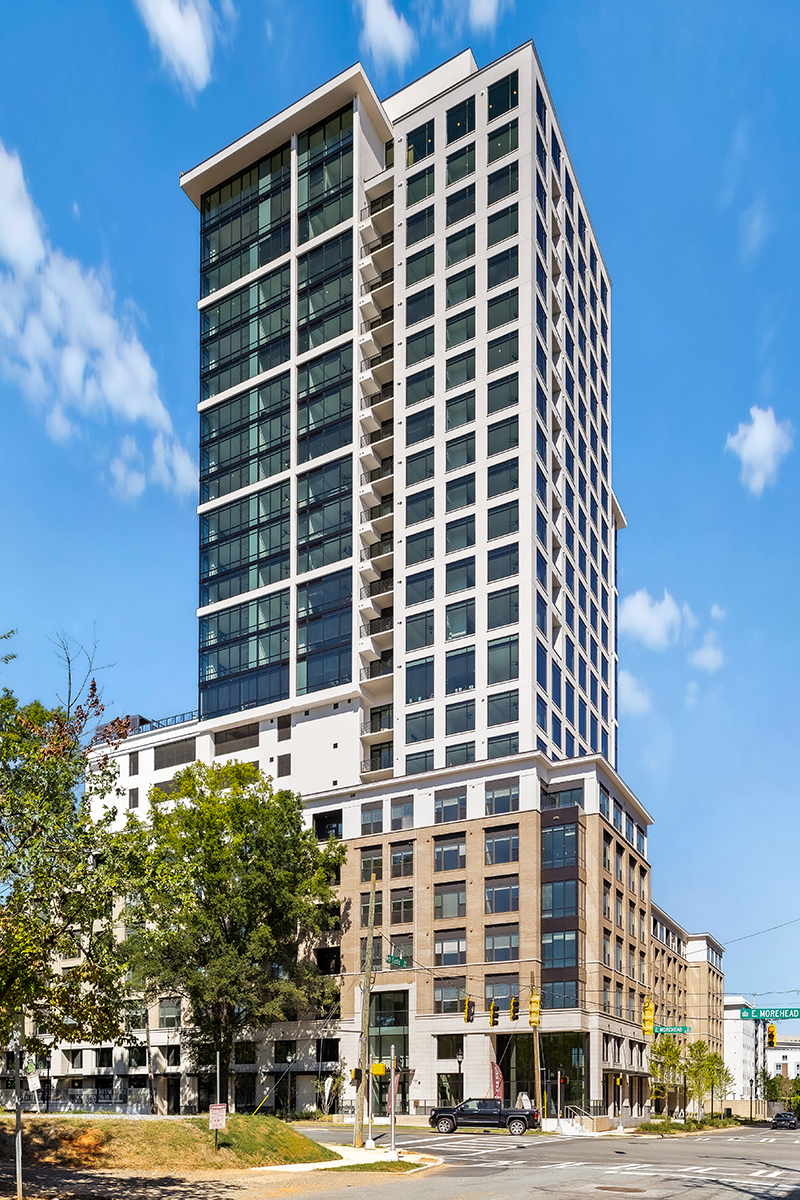 Radius Dilworth is composed of 2 buildings; a 26-story high-rise, The Overlook, and an 8-story mid-rise, The Enclave. 626 units tucked into the dense canopy of oaks on Morehead Street will rise high above the oaks with commanding downtown views while simultaneously embedded in the context of the pedestrian-friendly Dilworth community. The Overlook’s design aesthetic combines a downtown-facing, all-glass urban expression with a Dilworth-facing companion language, patterned to reflect residential and pedestrian scale with the charm of Dilworth. The design strives for understated elegance by drawing from hospitality design to address a more sophisticated resident.