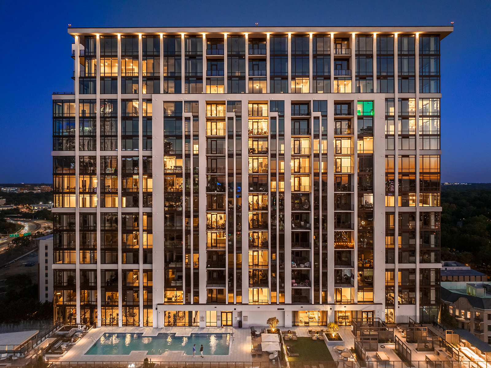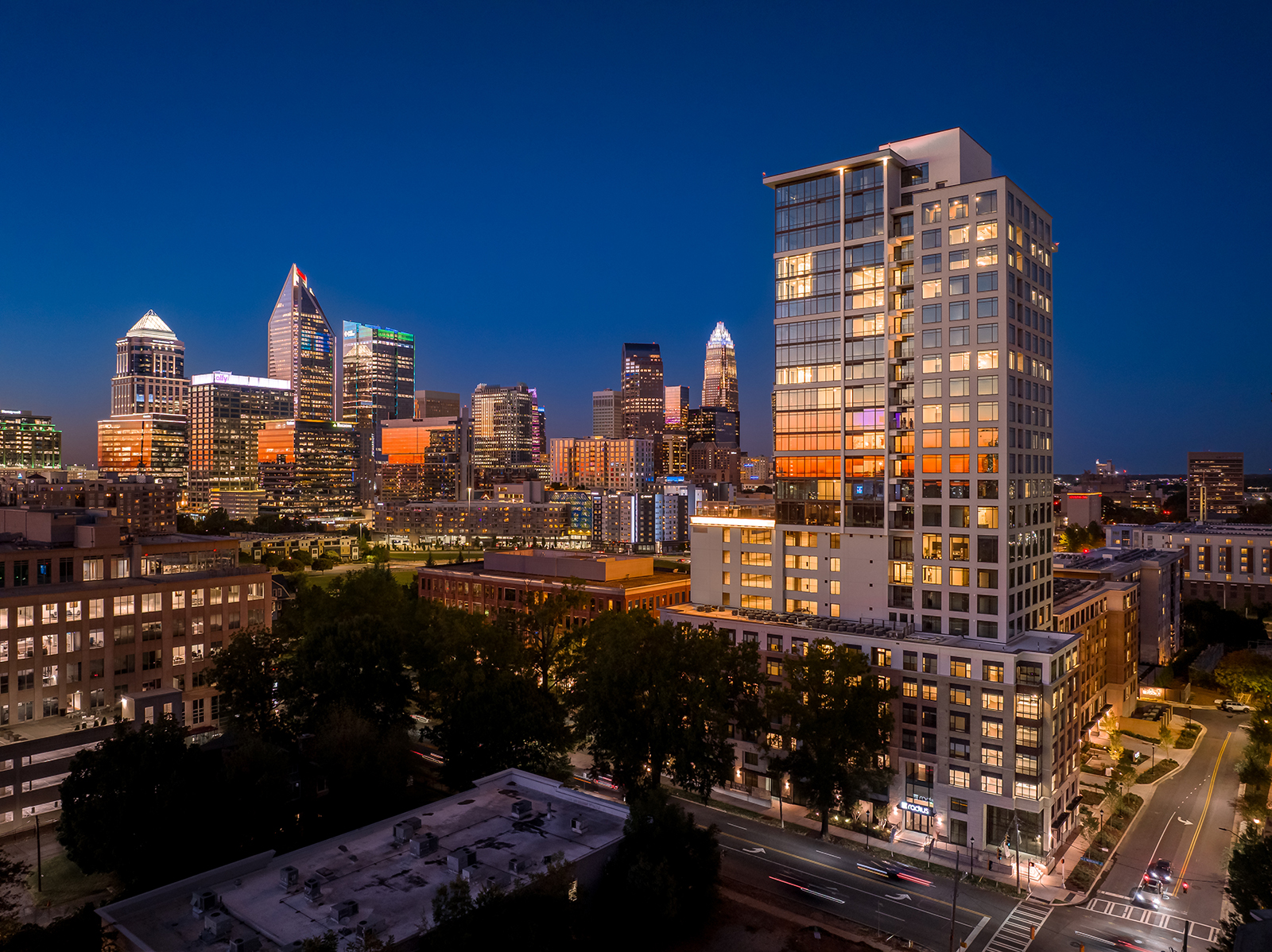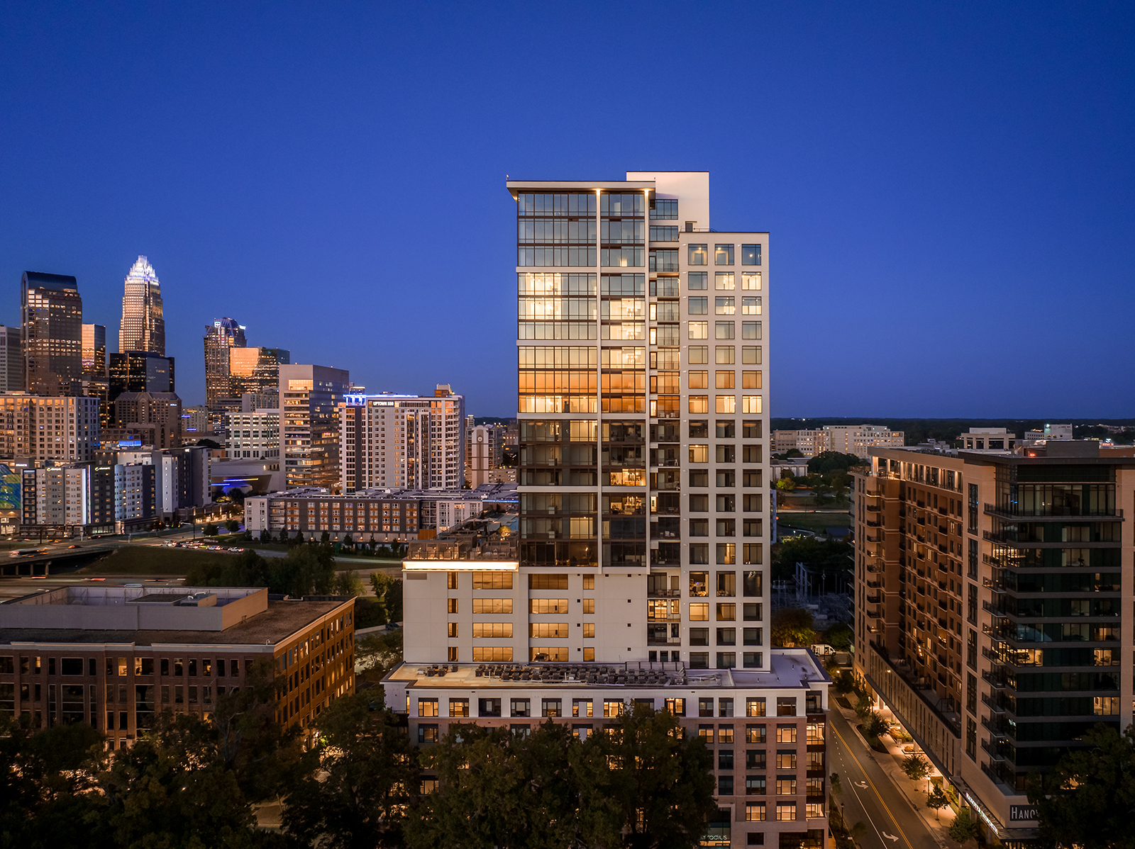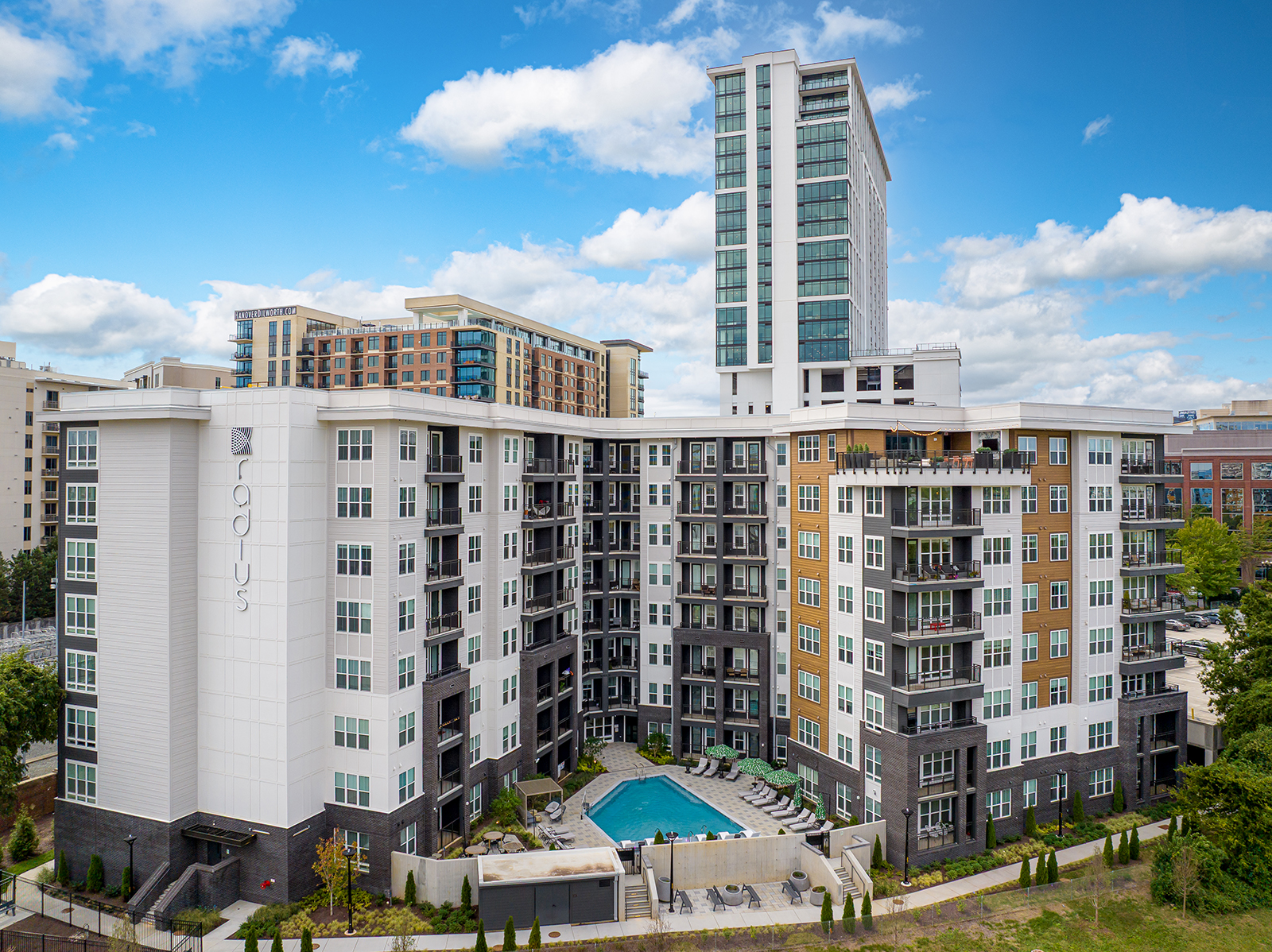 Radius Dilworth is composed of 2 buildings; a 26-story high-rise, The Overlook, and an 8-story mid-rise, The Enclave. 626 units tucked into the dense canopy of oaks on Morehead Street will rise high above the oaks with commanding downtown views while simultaneously embedded in the context of the pedestrian-friendly Dilworth community. The Overlook’s design aesthetic combines a downtown-facing, all-glass urban expression with a Dilworth-facing companion language, patterned to reflect residential and pedestrian scale with the charm of Dilworth. The design strives for understated elegance by drawing from hospitality design to address a more sophisticated resident.